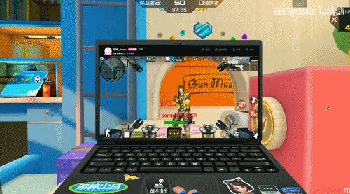 至于“电脑枪”,同样是离了个大谱,它的展现效果便是在游戏里拿这个笔记本电脑,并靠着电脑屏幕中的FPS画面瞄准并攻击敌人。