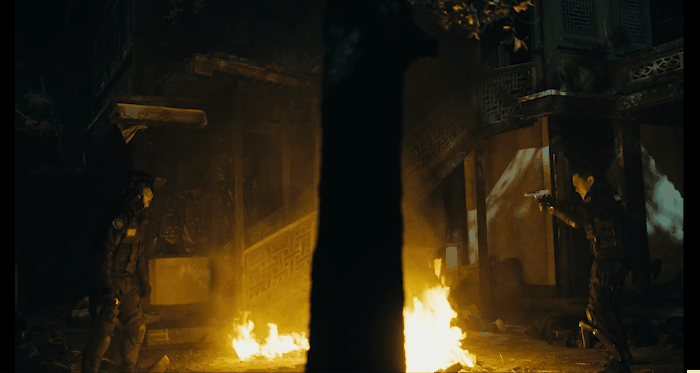 这种专业级的镜头运用,很容易令观众代入到小队成员视角,无需一句台词,便已令我们坠入那个肃杀且诡异、惊悚的氛围当中,深刻感受到将变丧尸的队员老庞选择用自杀解脱时,队友间浓烈的兄弟情义。