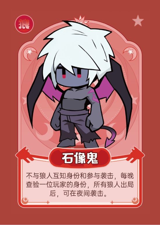 石像鬼是狼人杀阵营里的预言家,不能自爆,不能与其他狼人互知身份和参与袭击。石像鬼每晚都可以查验一位玩家的具体身份,只有当其他所有狼人出局后,才可在夜间袭击。