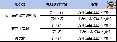 除元宝奖励外,根据每个服务器兑换纪念护符排名,稻米们还将获得5g~20g重量不等的龙年足金挂坠“飞龙在天”。本次奖励所有服务器皆有份,排名规则以及奖励明细如下: