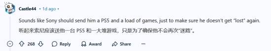 该新闻也被转发到了Reddit上,有网友表示:“听起来索尼应该送他一台 PS5 和一大堆游戏,只是为了确保他不会再次‘失踪’。”