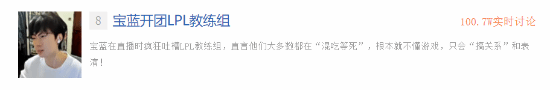 《英雄联盟》第二届“传奇杯”(老头杯)现已正式开赛,由前世界冠军Baolan带队的BL战队赢下由Uzi带队的GM战队获得小组赛首场比赛的胜利。近日Baolan在直播中谈到了LPL教练组的问题,吐槽他们大多数都在“混吃等死”,根本就不懂游戏,引发网友们热议。截止至发稿时,话题“宝蓝开团LPL教练组”登上贴吧热议榜。