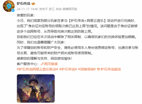 今日,《炉石传说》官方发文,针对网易云音乐活动出现“身份证对应账号的领取次数已达到上限”的情况作出回应。