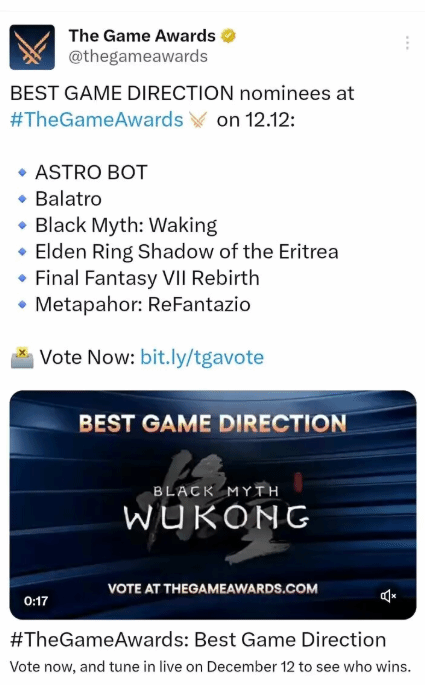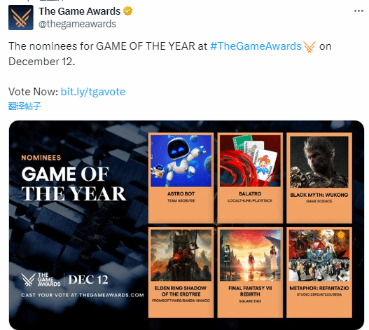 虽然官方在随后快速修改了推文内容,但这段时间的错误截图已经被许多玩家保存下来,并在社交媒体上传播。不少玩家对此吐槽:“在公布年度游戏提名这么重要的时刻,TGA犯这样的低级错误简直太不走心了。”