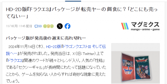 ·或许是因为玩家的怀旧情怀?《勇者斗恶龙3:HD-2D重制版》的Switch实体版盒装艺图设计将原初FC版、SFC复刻版以及最新的重制版三代封面设计融合在一起,而且是玩家在在购买后发现这个惊喜设计,导致需求量暴涨,被敏锐的黄牛们抓住时机。