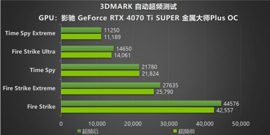 影驰在此为广大玩家带来3DMARK 自动超频前后的数据对比,通过实际数据为玩家体现该功能的强悍之处。测试采用影驰 GeForce RTX 4070 Ti SUPER 金属大师Plus OC进行,为玩家带来直观地数据对比。
