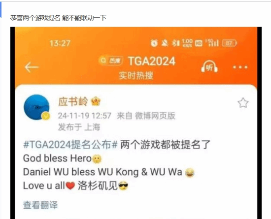 英雄游戏、英雄电竞创始人应书岭也在微博发文庆祝,并表示将会前往洛杉矶TGA颁奖典礼现场。