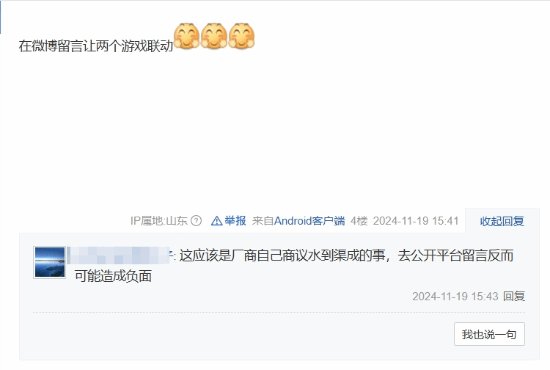 而在《鸣潮》的贴吧,也有网友转发了应书岭的博文,表示:“恭喜两个游戏提名 能不能联动一下。”“在微博留言让两个游戏联动”,期望《鸣潮》能够和《黑神话:悟空》进行联动。
