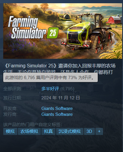 《模拟农场25》首发之后的评价却并不高,在Steam只有65%的好评率。优化问题、网络连接问题以及游戏bug,都严重影响了玩家们对本作的印象和观感。好在官方一直在积极响应各种反馈,并通过更新解决问题。当前,《模拟农场25》的好评率已经来到了73%。