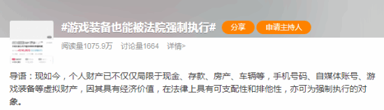 报道指出,现如今,个人财产已不仅仅局限于现金、存款、房产、车辆等,手机号码、自媒体账号、游戏装备等虚拟财产,因其具有经济价值,在法律上具有可支配性和排他性,亦可为强制执行的对象。(来源:紫牛新闻)