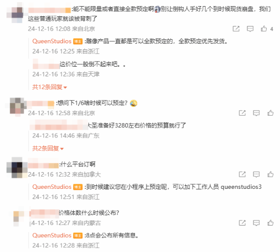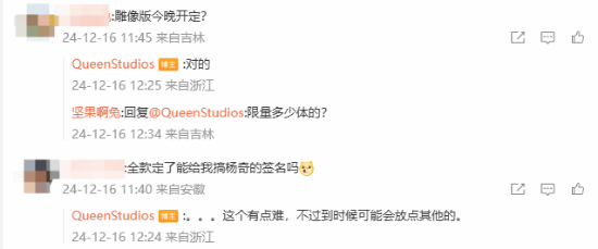 有玩家担心黄牛,表示:“能不能限量或者直接全款预定啊,别让倒钩人手好几个到时候现货崩盘,我们这些普通玩家就该被背刺了。”QueenStudios官方称:“雕像产品一直都是可以全款预定的,全款预定优先发货。”还有玩家调侃:“全款定了能给我搞杨奇的签名吗?”QueenStudios官方表示:“这个有点难,不过到时候可能会放点其他的。”
