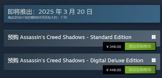 随着育碧发布《刺客信条:影》新的剧情预告,本作的预购终于再次开放。国区售价为348元(548港元),与之前的价格一致。游戏将于3月20日正式发售,应该不会第三次跳票。