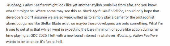 从表面上看,《明末:渊虚之羽》或许只是又一款类魂游戏,你甚至可能会戏称它是“女版黑神话”。玩家可能会因女主角的设定而入坑,但这款游戏的魅力绝不仅限于此。毕竟,像《剑星》这样的作品已经证明了,性感与硬核可以共存。而在2025年GDC的试玩之后,我对《明末》的兴趣大大提升,可以说,这款游戏不仅具备扎实的魂系玩法,更重要的是,它玩起来真的很爽。