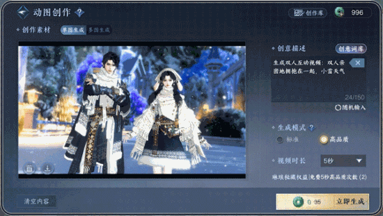 不仅如此,此功能还可支持双人互动。玩家可以通过恰当的描述,让双人图片中的两个角色进行互动,例如下图便是输入描述语“生成双人互动视频:双人亲密地拥抱在一起”后生成的温馨浪漫的双人互动画面。