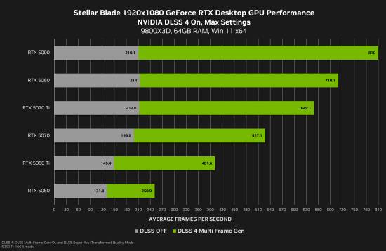 英伟达表示,在4K最高画质设定下,开启DLSS 4后,RTX 50系列显卡性能平均提升达3.4倍,RTX 5090可达到540帧的惊人帧率,RTX 5080和RTX 5070 Ti突破300帧大关,RTX 5070也能达到260帧以上。
