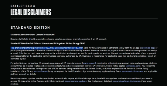 据外媒wccftech报道,在《战地6》官网的免责条款里有一处关键信息,基本证实了上述发售日期的准确性。法律声明显示预购优惠将于10月10日截止,兑换码有效期将持续至2027年10月10日(为期两年),wccftech认为,这或许意味着《战地6》真的会在10月10日发售。截至发稿前,该页面已被删除。