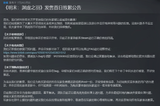 因标准版与豪华版奖励分发异常,国产游戏《明末:渊虚之羽》官方于昨日发布正式致歉公告,并宣布将向所有已购玩家免费赠送原价25元的游戏原声音乐集作为补偿。