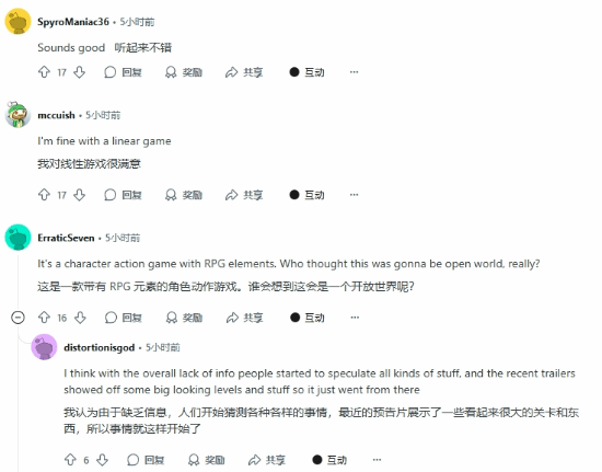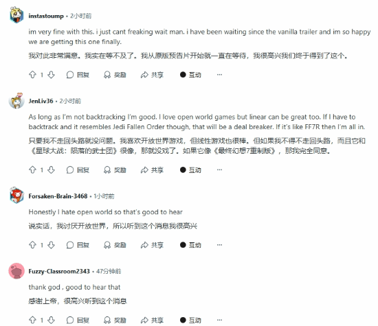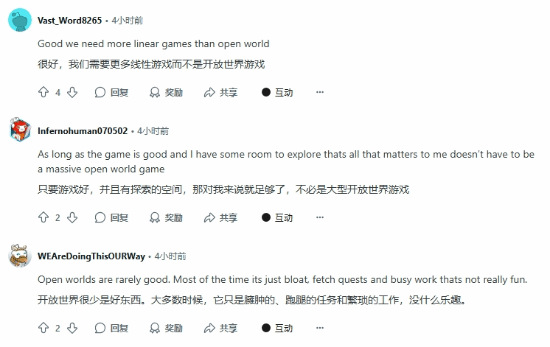 还有玩家对游戏为纯线性流程表示开心:“很好,我们需要更多线性游戏而不是开放世界游戏。”