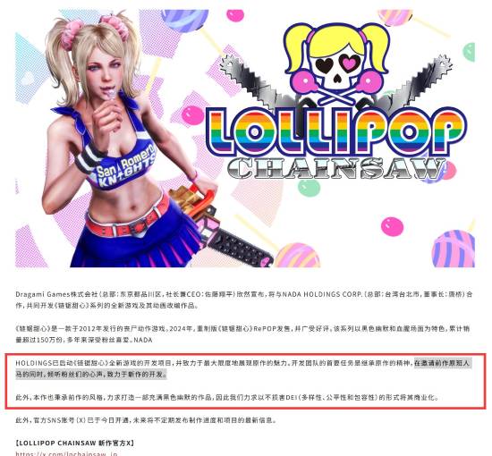 根据Dragami Games最近的公告,他们提到其新合作伙伴Nada Holdings将会召回部分参与 2012 年原版《电锯甜心》的原始工作人员,但目前尚未公布具体的人名和职位。双方都强调致力于保持原版游戏的魅力精髓。