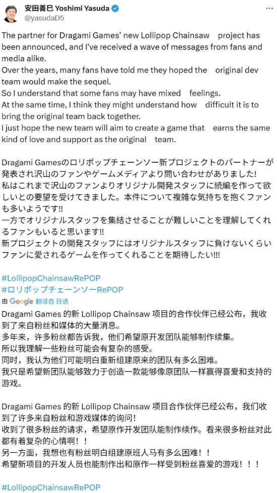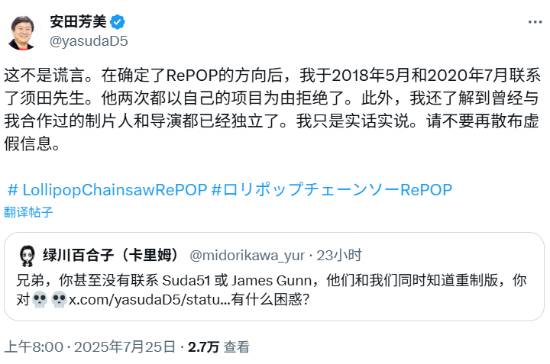 然而,针对安田的声明,一位用户提出了质疑,称安田在启动重制版项目《电锯甜心 RePOP》时“甚至没有尝试联系须田刚一或詹姆斯·古恩”。该用户暗示安田关于“难以召集原班人马”的说法不够诚实,并声称须田刚一和古恩是在与粉丝同一时间才得知这个项目的。