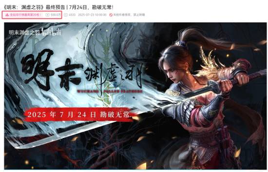 《明末:渊虚之羽》最终预告于7月23日发布,2天多的时间该预告在B站的播放量已经突破了500万。