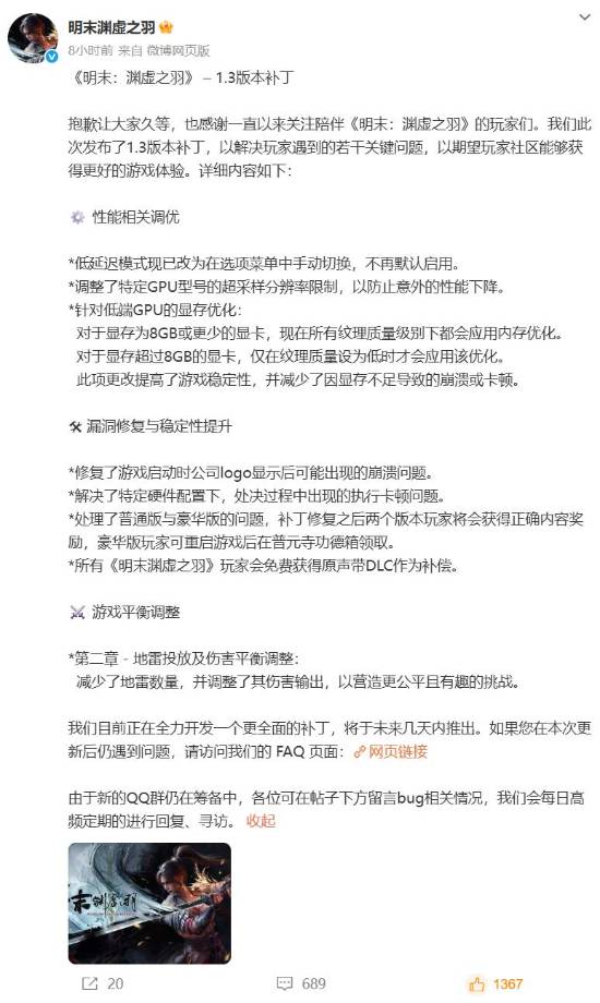 《明末:渊虚之羽》也于昨日正式发售,既创下了1小时内Steam在线人数峰值破10万的壮举,也因优化、价格及预购奖励等问题而引发了一些争议。官方也在发售当日发布了首日致歉公告,对游戏优化表现未达预期及外区价格差异等问题致歉,并针对这些问题给出了解决方案。