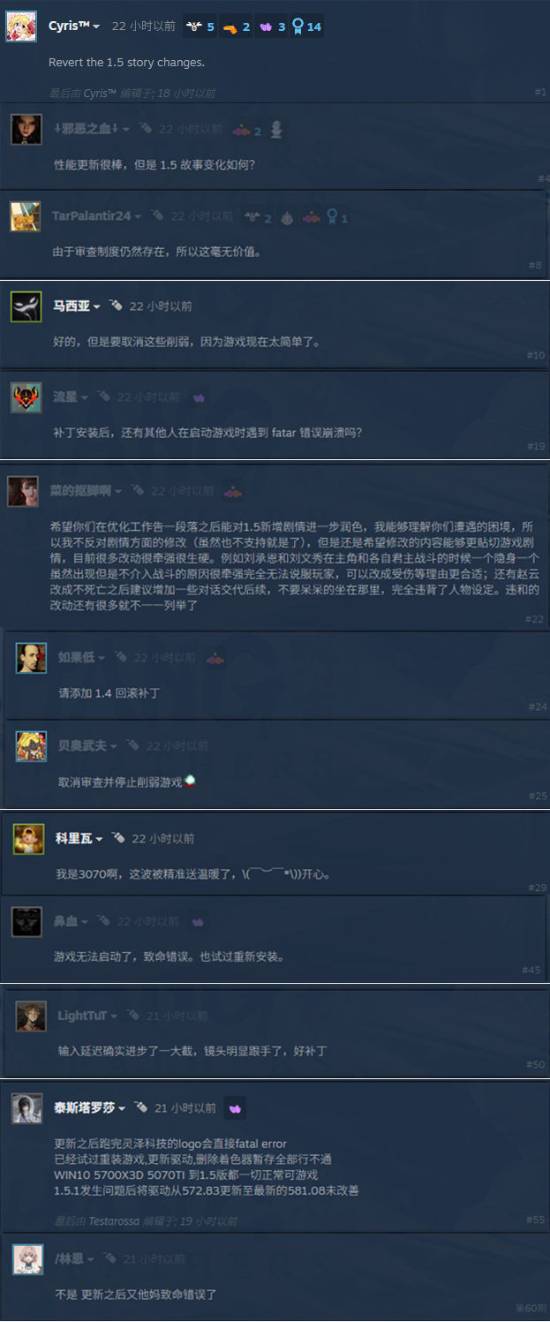 然而,也有玩家反馈仍会遇到Fatal Error报错。同时,一些海外玩家对1.5版本修改剧情与玩法表示不满,尤其是高难度关卡的调整,被部分玩家视为“删减”或“阉割”内容。