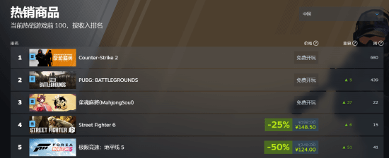 根据Steam商店数据显示,截止至发稿时《街头霸王6》已登上了国区热销榜第4位,排在前面的《CS2》、《PUBG》和《雀魂麻将》均为免费游戏,也就是说《街霸6》目前排在付费游戏第一位!这很大可能是XIAOHAI夺冠后引发的入坑潮!
