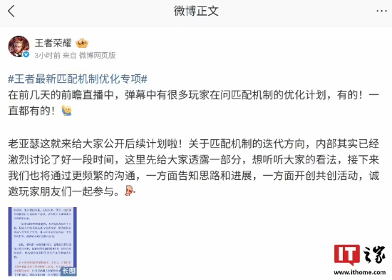 在前几天腾讯《王者荣耀》S41 赛季前瞻直播中,有玩家询问匹配机制优化计划。游戏官方今日回应称一直都有优化计划,并表示关于匹配机制的迭代方向,内部已激烈讨论了一段时间,接下来将通过更频繁的沟通,一方面告知思路和进展、一方面开创共创活动,邀请玩家一起参与。