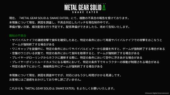 《合金装备3:重制版》官推发布公告,称已收到多份异常问题报告,大多是游戏崩溃强制关闭。目前正在努力制作修复补丁,一旦准备推送补丁,会再次发布公告。
