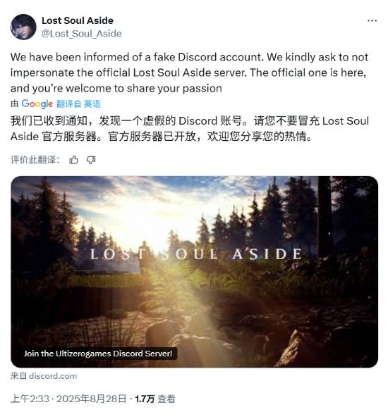 我们已收到通知,发现一个虚假的Discord账号。请您不要冒充Lost Soul Aside官方服务器。官方服务器已开放,欢迎您分享您的热情。