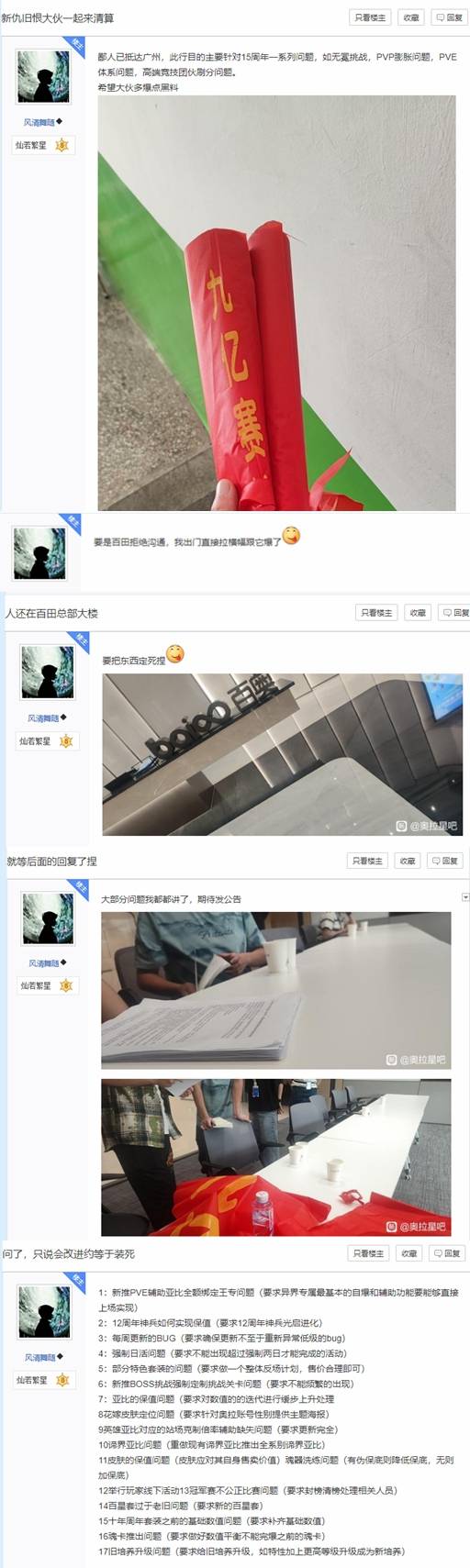 据悉,8月中旬,贴吧网友@风清舞随发帖称自己已抵达广州,此行目的是就游戏15周年相关问题进行当面沟通,包括“无冕挑战”、PVP数值膨胀、PVE体系缺陷、高端竞技环境刷分等情况。他同时还在贴吧征集玩家意见,许多玩家也借此表达了对后期数值膨胀、产能不足、玩法单一以及“逼氪”操作的强烈不满。