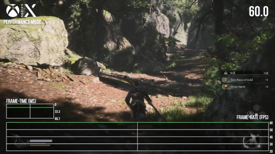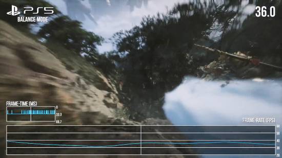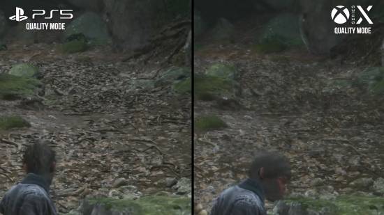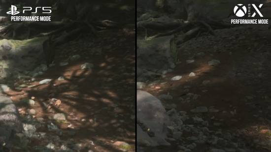 不过,《黑神话:悟空》似乎有些不同,在XSX上,性能模式下画质略有缩水,大量光照细节被也不明显。PS5的性能模式则是通过帧生成技术保持在60帧,带来轻微的延迟感和画面伪影,平衡模式选择在60Hz输出下锁定45fps。总体来说,两台主机的画质/性能模式,都没能呈现出现世代应有的水准。