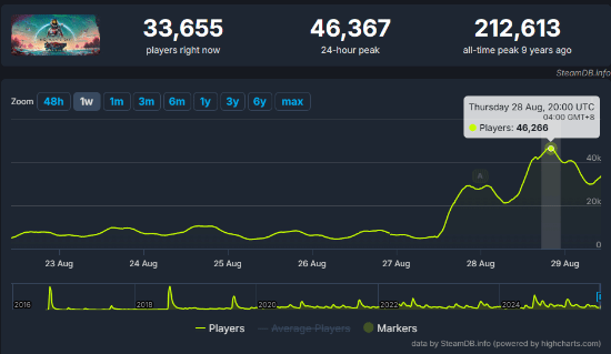 Steam数据显示,新版本更新前夕的在线峰值约为8669人。更新后,同时在线人数直接飙升至46367人!而且明天就是周末,该数据很有可能进一步刷新。