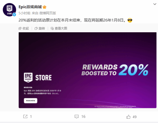本次20%返利的活动原定于8月31日截止,不过今天下午Epic官方发文宣布,该活动将延期至2026年1月8日!