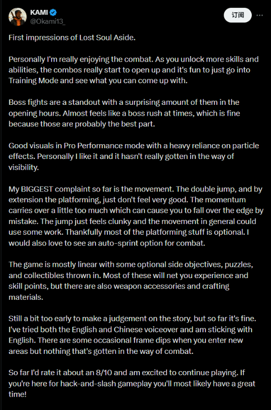 近日,知名游戏推主@KAMI分享了对《失落之魂》的初体验感受,并晒出了一段游戏视频。