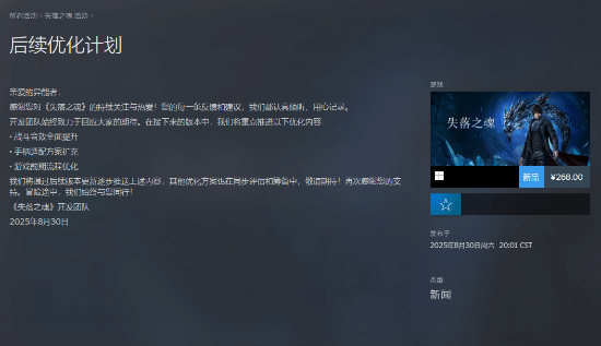 《失落之魂》现已正式发售,游戏在Steam商店的评价已经出炉,截至发稿前为“褒贬不一”。8月30日,官方公开了《失落之魂》的后续优化计划,表示开发团队始终致力于回应玩家的期待,在接下来的版本中,《失落之魂》将重点推进以下优化内容: