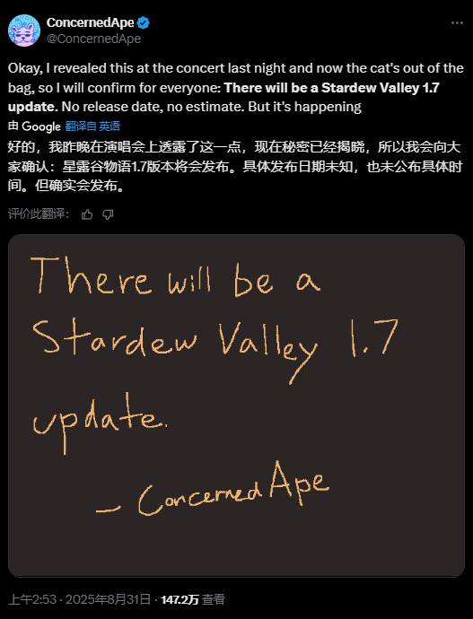 8月31日,ConcernedApe宣布将会推出《星露谷物语》1.7版本,该版本正在开发,具体发布日期暂未公开,敬请期待。