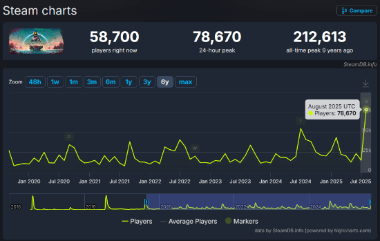 截至发稿前,据SteamDB数据显示,当前在Steam平台游玩《无人深空》的玩家数量已经达到了58700人,24小时玩家最高在线峰值达到了78670人,在Steam平台的玩家数量创下了近6年来的最高纪录,Hello Games官方则以“双手合十”表情作为回应。