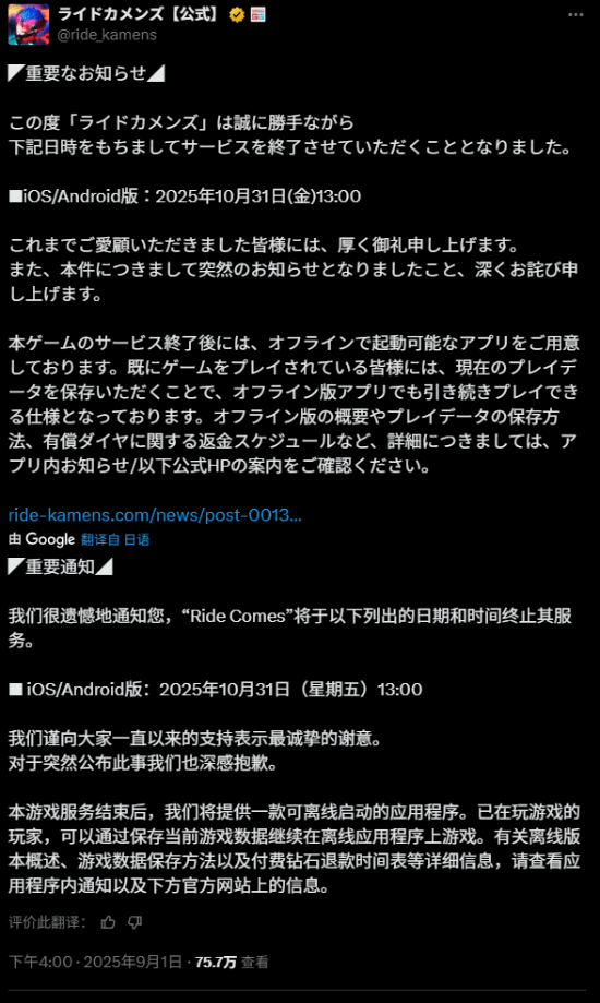 今日,《假面骑士》系列女性向手游《RIDE KAMENS》官方发文宣布,该作将于10月31日停止服务,并计划在停服后推出离线版。