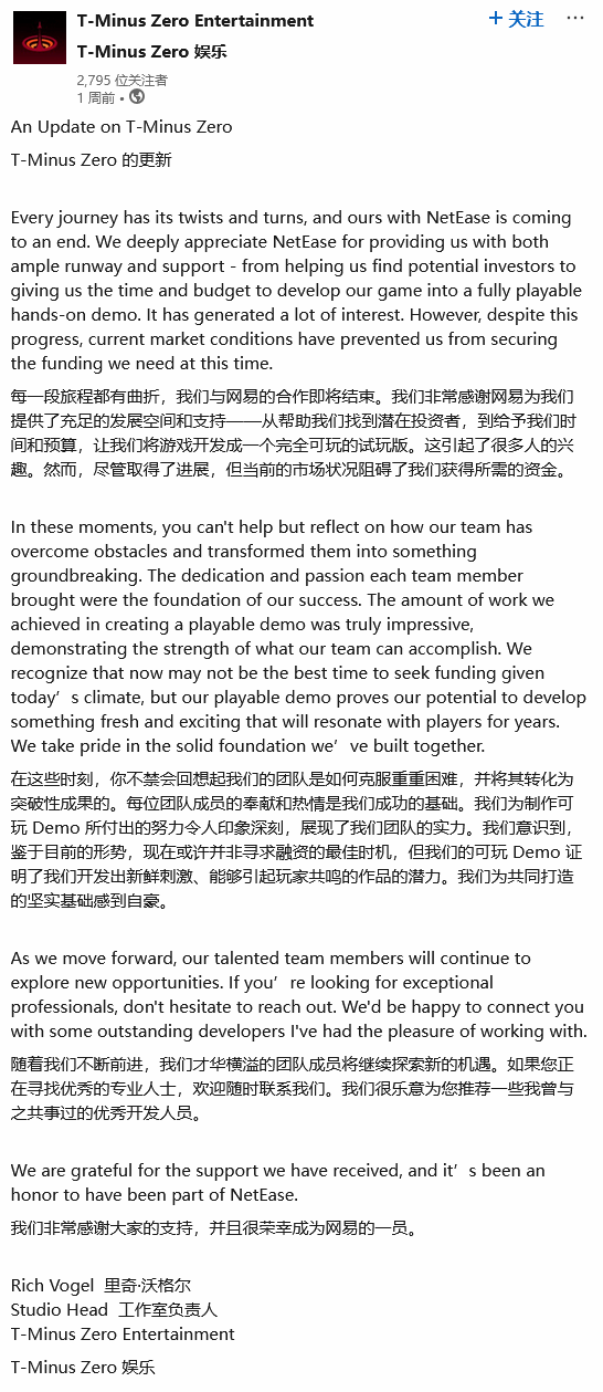 Rich Vogel在工作室的领英账号上发文,宣布工作室与网易的合作关系结束: