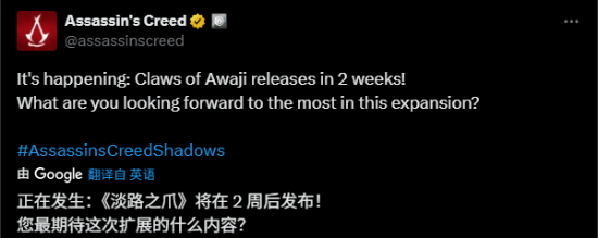 《刺客信条:影》首个DLC“淡路之爪”即将于9月16日上线。育碧今日发布动态,提醒玩家们还有两周就可以玩了。“淡路之爪”玩法剧情需要通关主线后才能体验,更多细节介绍会于后续再公布。