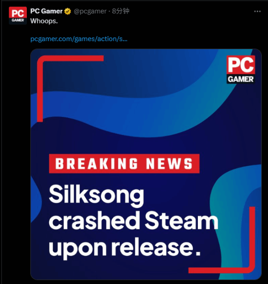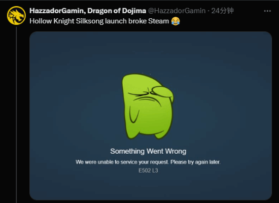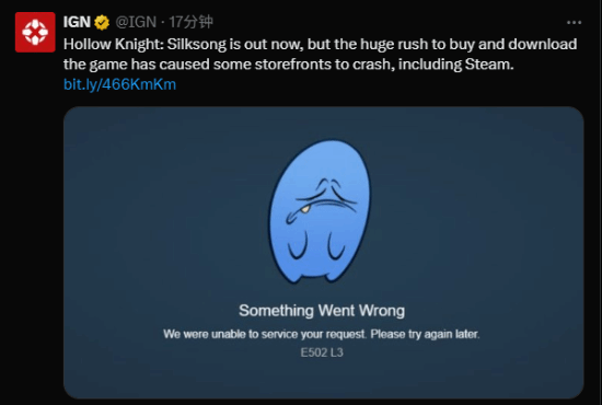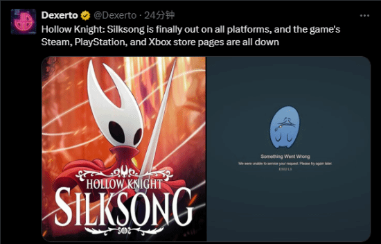 《空洞骑士:丝之歌》已正式发售,不过由于没开预购,同一时间购买的人数太多,直接把Steam、Xbox、PS、Switch等多个平台都给干崩了!很多外媒和游戏博主都晒出了崩溃图,一起来看看。