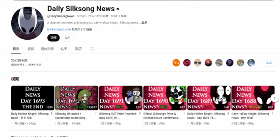 Daily Silksong News正如其名(丝之歌每日新闻),由丝之歌社区成员Araraura运营,他每天都会发布一条视频,更新当天是否有关于《丝之歌》的新闻。尽管形式简单,但Araraura极其执着。自开频道以来,他已经制作了1,693条视频,从未间断一天。