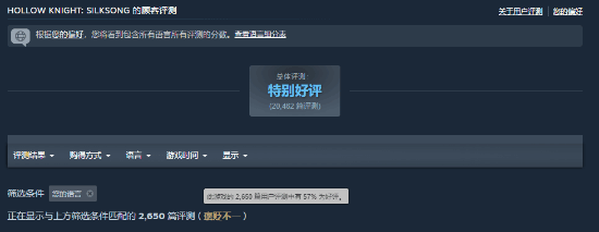 万众期待的《空洞骑士:丝之歌》现已正式发售,游戏在Steam平台的最新评价已经出炉。截至发稿前,游戏在国区的评价为“褒贬不一”,好评率为57%。