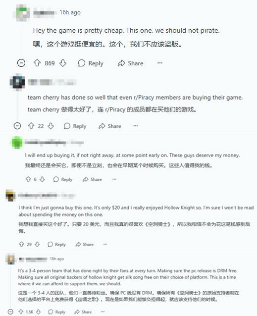 据外媒pcgamer报道,在Reddit论坛拥有240万成员的“盗版”专区里,有不少游玩盗版的玩家呼吁人们去购买正版的《空洞骑士:丝之歌》,因为它真的值得这个售价。“这游戏真的很便宜,我们不应该下载盗版。”“我最终会买下它的,就算不是马上,也会在不久的将来,因为这些开发者值得我花钱去支持。”