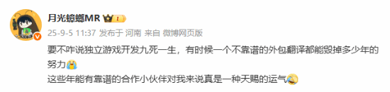 9月5日,《黑森町绮谭》《烟火》《三伏》开发者“月光蟑螂MR”在微博发文,对此事表达了自己的看法:“要不咋说独立游戏开发九死一生,有时候一个不靠谱的外包翻译都能毁掉多少年的努力,这些年能有靠谱的合作小伙伴对我来说真是一种天赐的运气。”