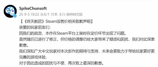 小高和刚新作《终天教团》的发行商SpikeChunsoft今日发布致歉声明,回应了有关本作Steam版本发售后定价暴涨一事。