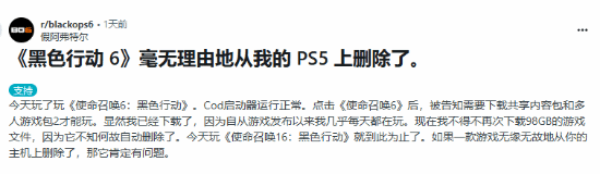 帖主表示,”在今天想要玩《黑色行动6》时,我的COD启动器运行是正常的,但是在运行《黑色行动6》的时候却被意外告知需要下载其他内容。可我已经下载了,因为从游戏发布后我每天都在玩。现在我不得不重新下载98GB的游戏文件,因为它莫名其妙被自动删除了。今天只好不玩了,如果一款游戏能无缘无故地从你的主机上删除,这里面绝对有问题。