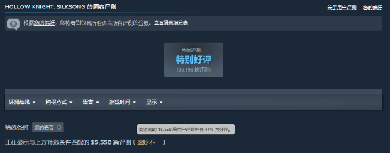 万众期待的《空洞骑士:丝之歌》现已正式发售,截至发稿前,游戏在Steam平台的简体中文区好评率再次从之前的48%跌至44%,且仍旧有不断下跌的趋势。除此之外,游戏所有评测的好评率也跌至了82%。